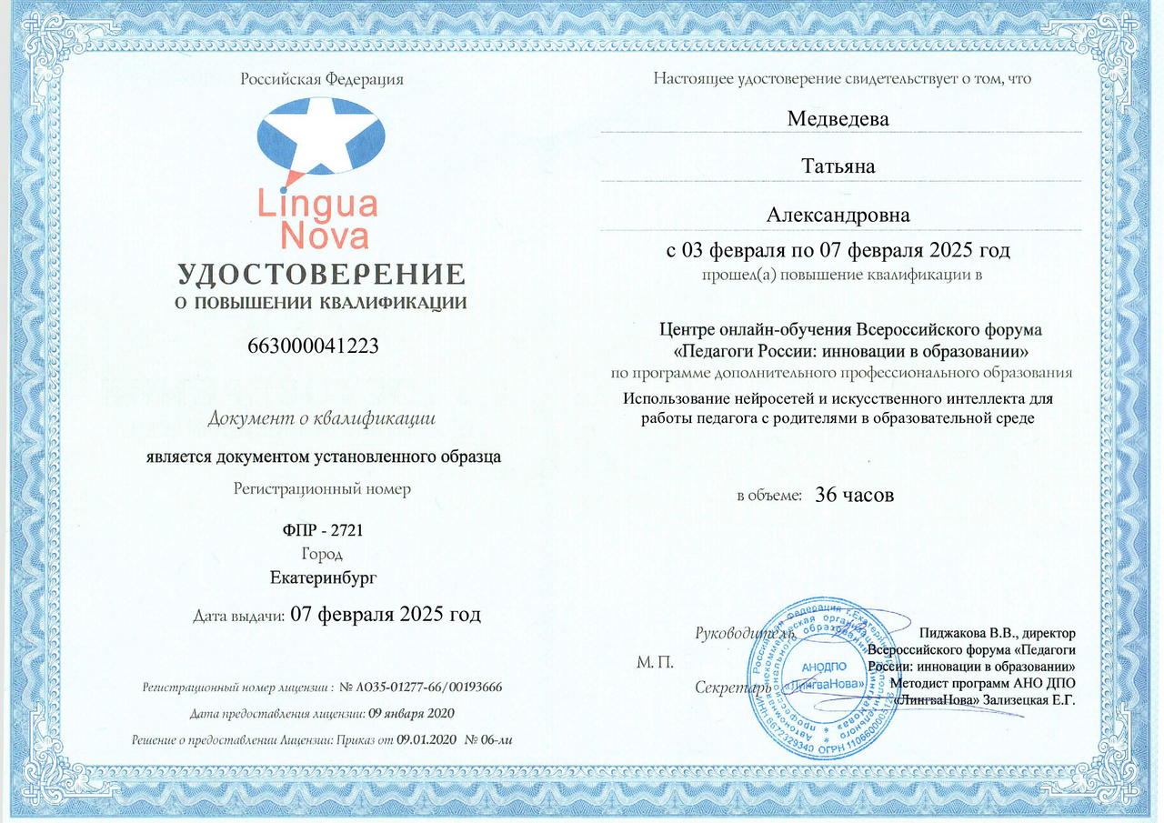 Программа дополнительного профессионального образования «Использование нейросетей и искусственного интеллекта для работы педагога с родителями в образовательной среде». Удостоверение от 07.02.2025.