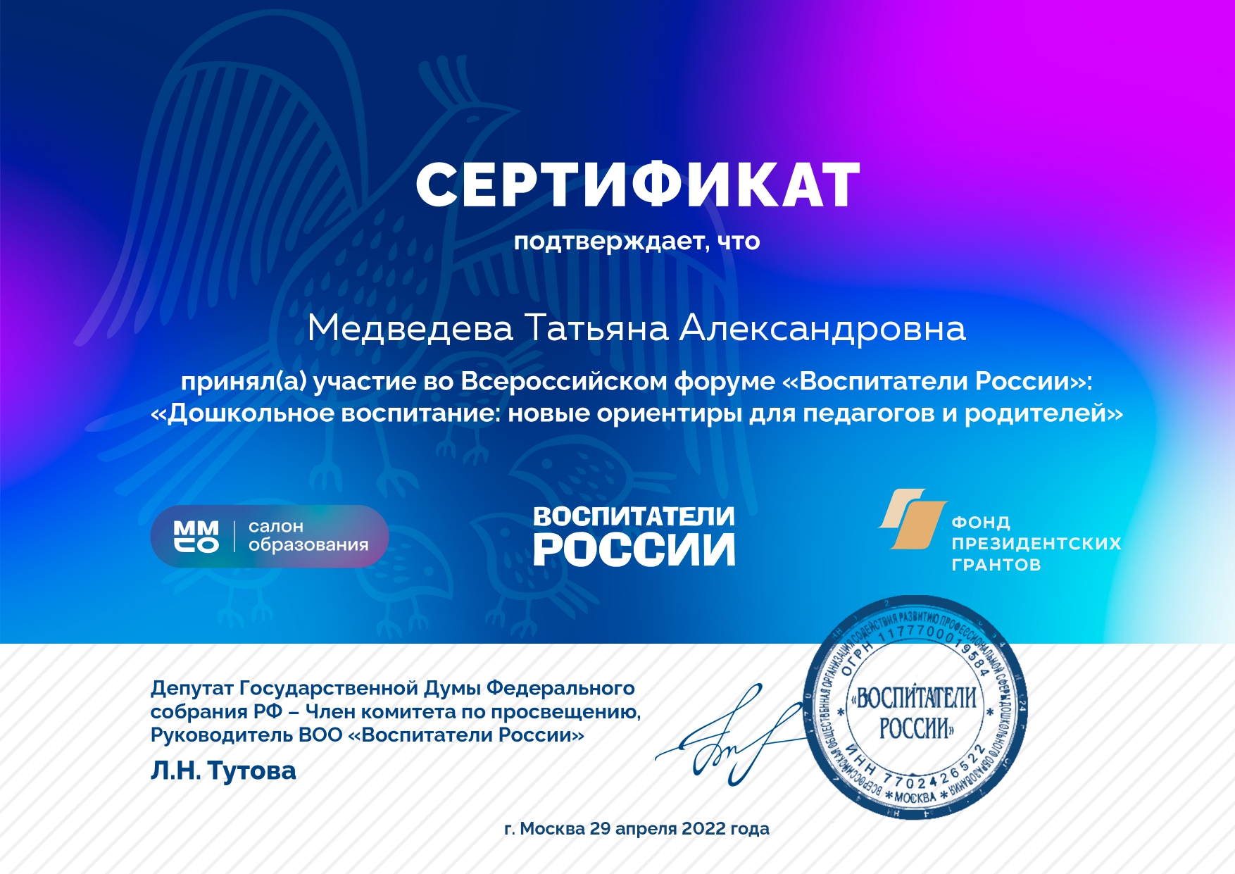 ВСЕРОССИЙСКИЙ ФОРУМ «ВОСПИТАТЕЛИ РОССИИ»: «ДОШКОЛЬНОЕ ВОСПИТАНИЕ: НОВЫЕ ОРИЕНТИРЫ ДЛЯ ПЕДАГОГОВ И РОДИТЕЛЕЙ» от 29.04.2022 г.