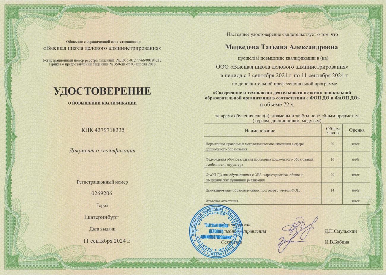 Дополнительная профессиональная программа "СОДЕРЖАНИЕ И ТЕХНОЛОГИИ ДЕЯТЕЛЬНОСТИ ПЕДАГОГА ДОШКОЛЬНОЙ ОБРАЗОВАТЕЛЬНОЙ ОРГАНИЗАЦИИ В СООТВЕТСТВИЕ С ФОП ДО И ФАОП ДО", регистрационный номер 0141499