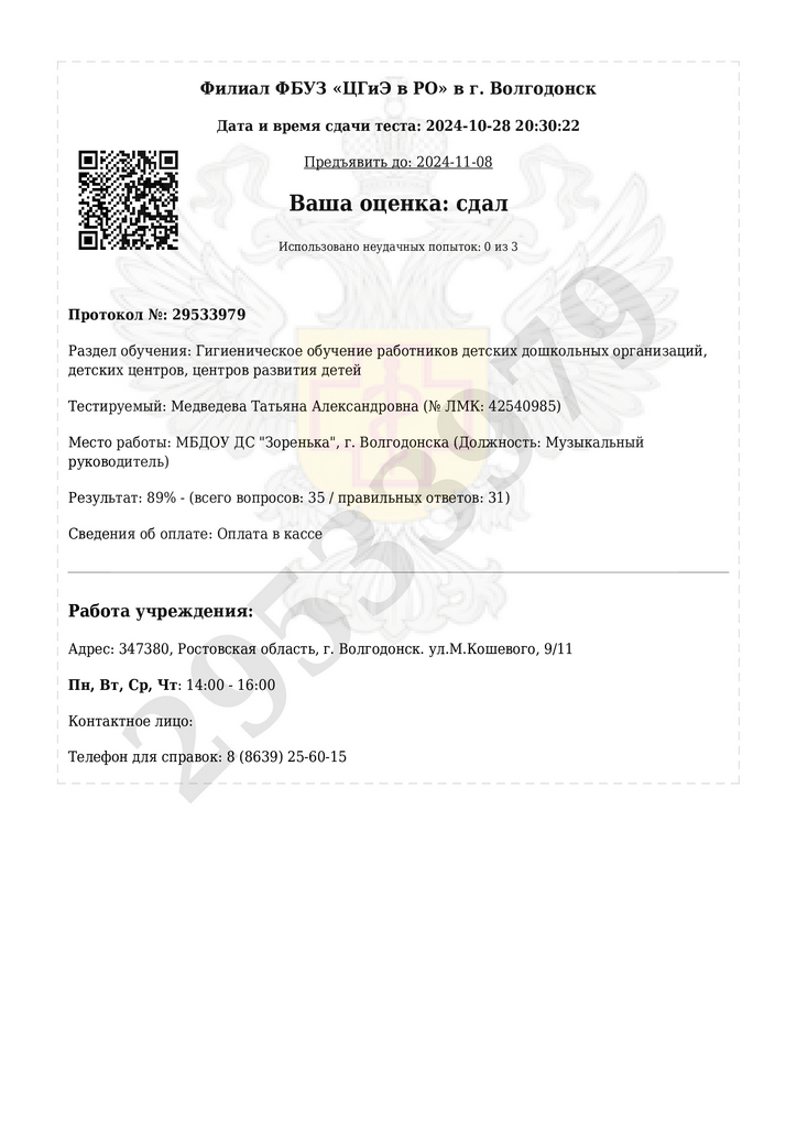 «ГИГИЕНИЧЕСКОЕ ОБУЧЕНИЕ РАБОТНИКОВ ДЕТСКИХ ДОШКОЛЬНЫХ ОРГАНИЗАЦИЙ, ДЕТСКИХ ЦЕНТРОВ, ЦЕНТРОВ РАЗВИТИЯ ДЕТЕЙ». Протокол №29533979 от 28.10.2024 г.