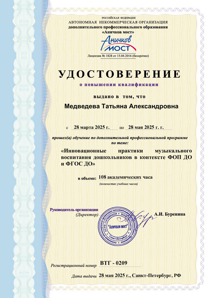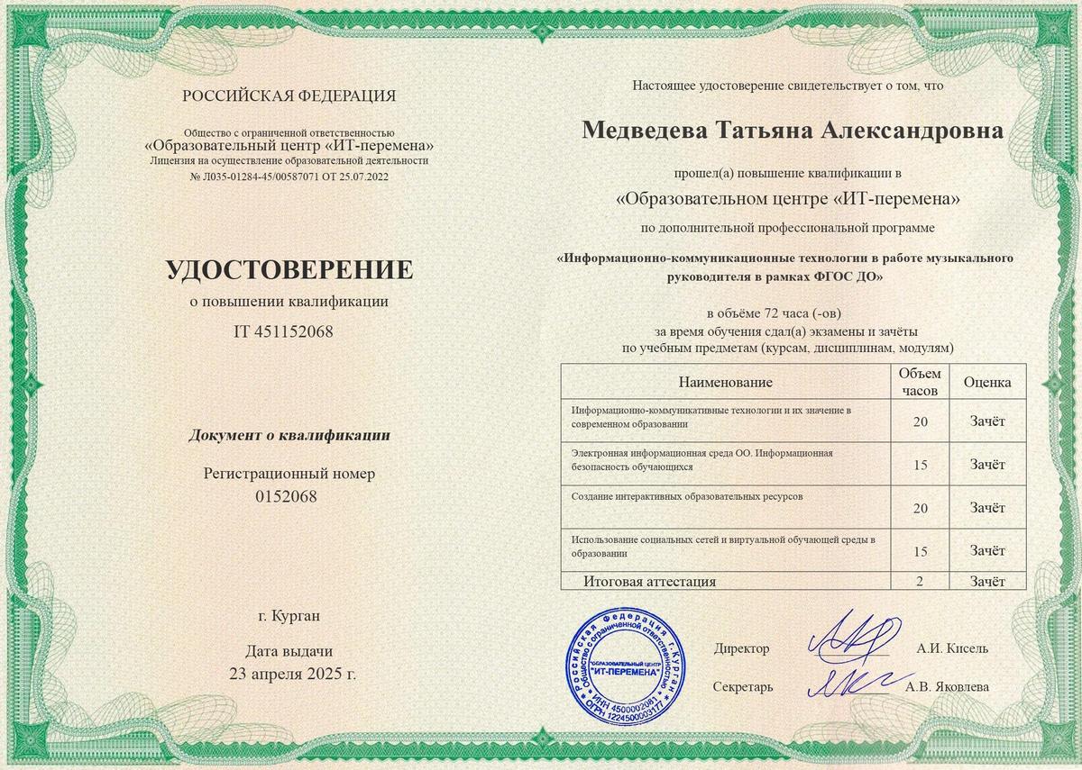 Программа дополнительного профессионального образования «ИНФОРМАЦИОННО-КОММУНИКАТИВНЫЕ ТЕХНОЛОГИИ В РАБОТЕ МУЗЫКАЛЬНОГО РУКОВОДИТЕЛЯ В РАМКАХ ФГОС ДО».. Удостоверение от 23.04.2025.