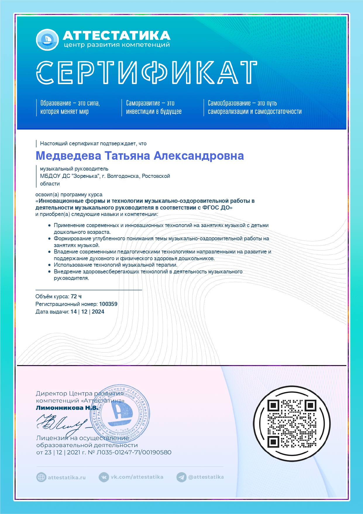 (Центр развития компетенций «Аттестатика» . 72часов. Форма обучения: дистанционно. Направленность: иное).