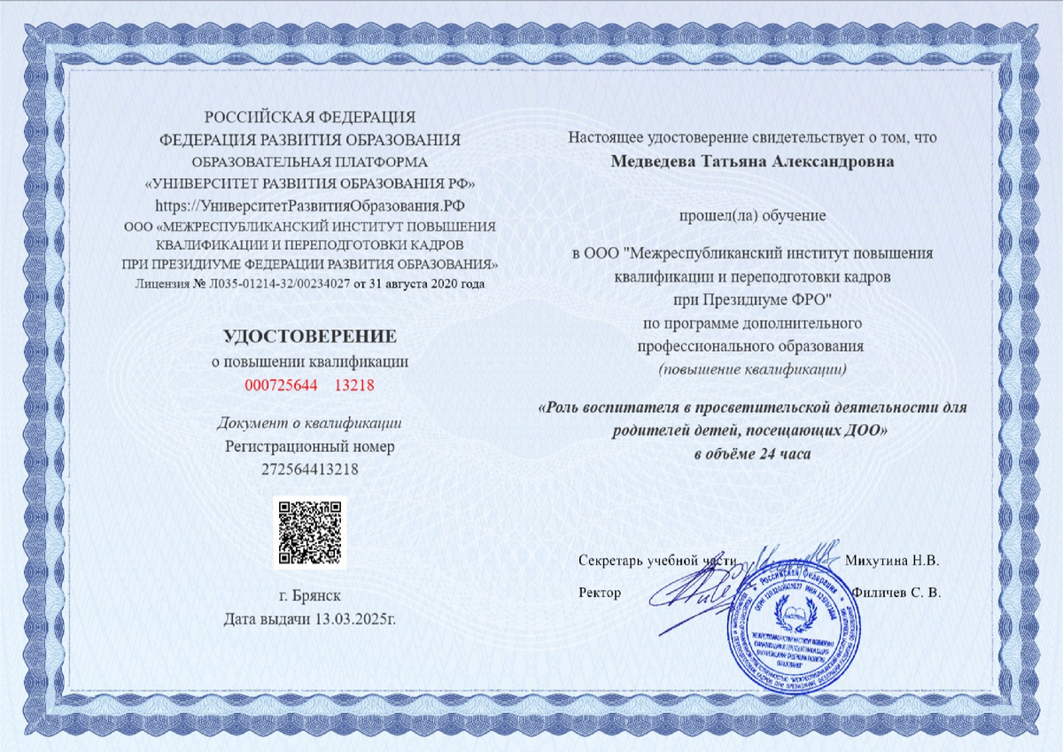 Программа дополнительного профессионального образования «Роль воспитателя в просветительской деятельности родителей детей, посещающих ДОО». Удостоверение от 13.03.2025.