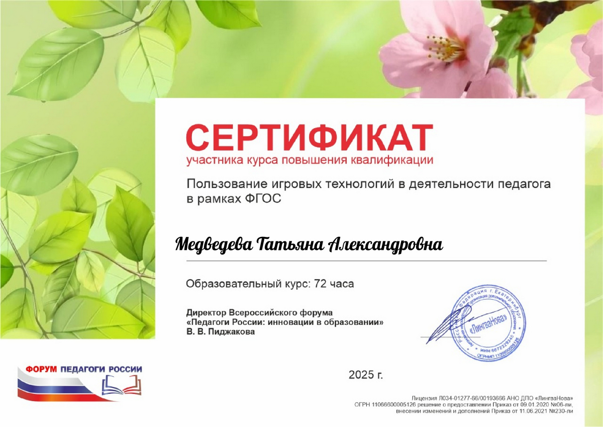 Курс «ПОЛЬЗОВАНИЕ ИГРОВЫХ ТЕХНОЛОГИЙ В ДЕЯТЕЛЬНОСТИ ПЕДАГОГА В РАМКАХ ФГОС». Сертификат от 10.05.2025.